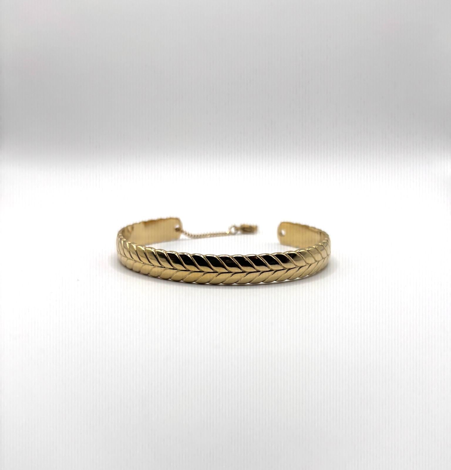Sa structure ouverte, associée à une chaînette d’ajustement, lui donne une allure contemporaine tout en conservant une inspiration qui dialogue avec l’esthétique des parures métalliques traditionnelles, souvent conçues pour allier présence visuelle et élégance.