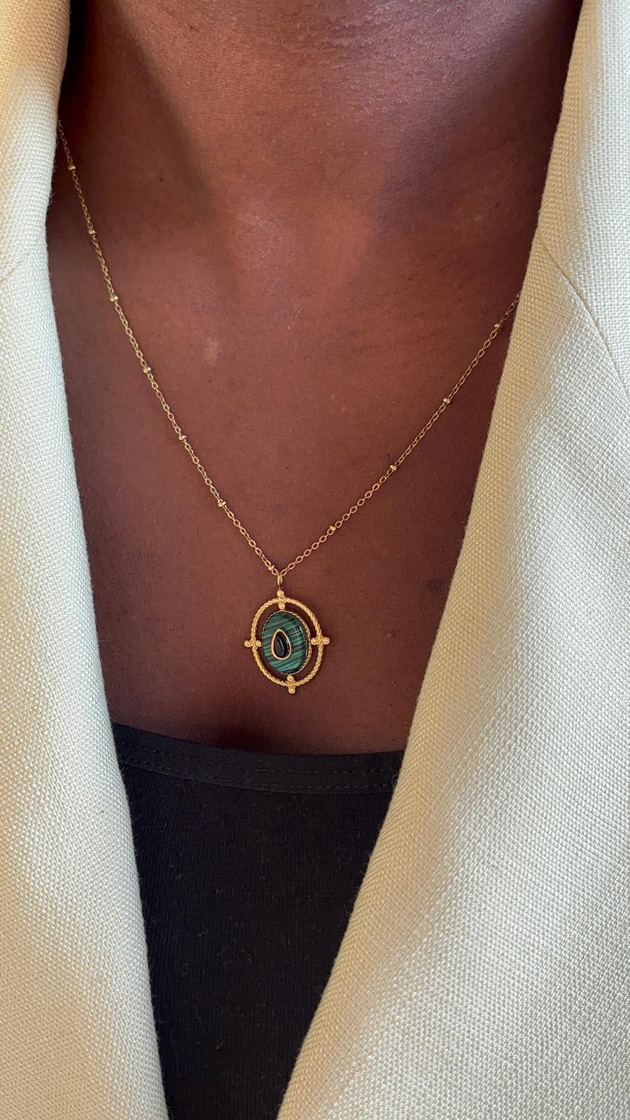 Un pendentif doré solaire, ce collier en acier inoxydable, est rehaussé d’une pierre verte symbolisant la vitalité et l’abondance. Inspiré des traditions africaines où le cercle et la couleur verte incarnent la vie et la prospérité.