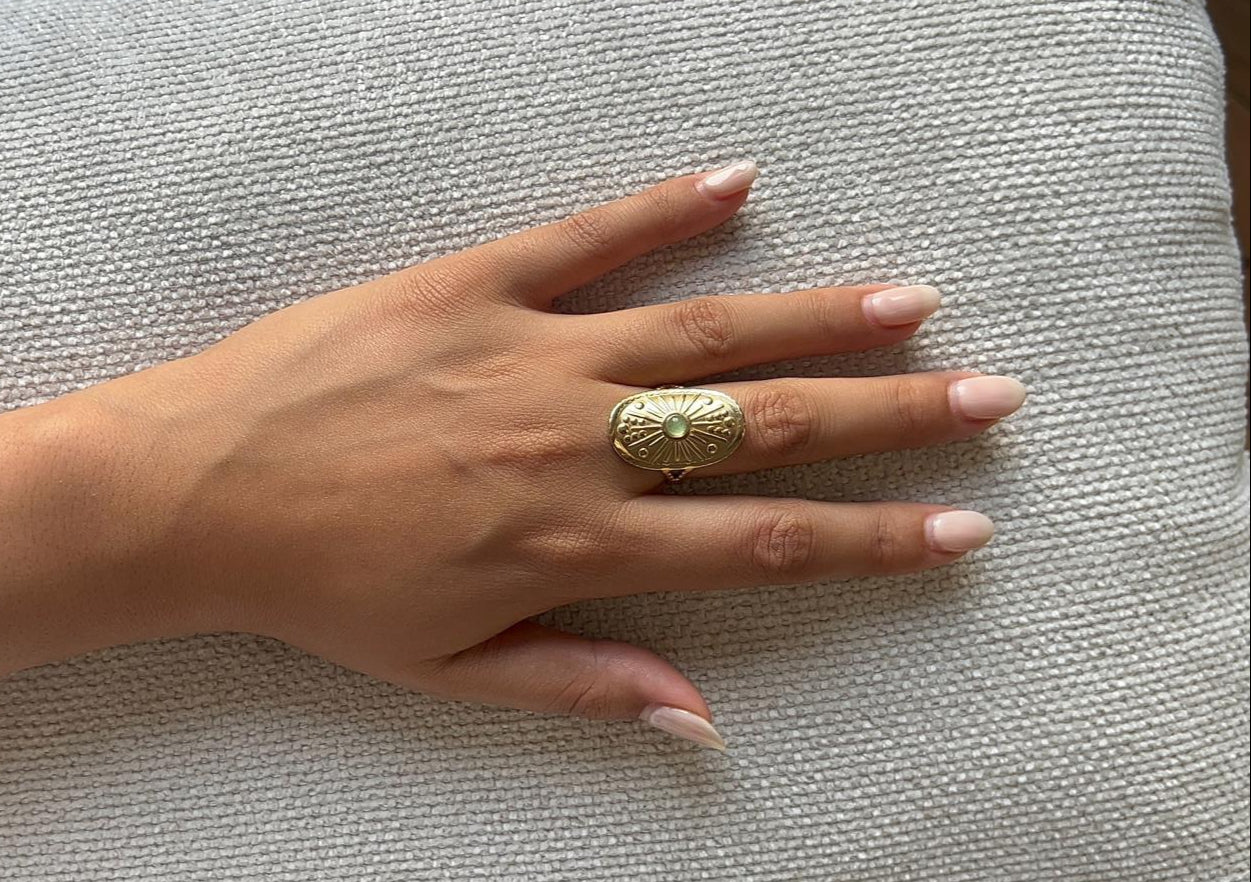 Cette bague dorée, en acier inoxydable et ajustable, aux motifs rayonnants s’inspire de l’orfèvrerie ouest-africaine, où le soleil représentait la vie et la prospérité. Sa pierre centrale verte, couleur de fertilité et d’abondance, en fait un talisman élégant et intemporel.