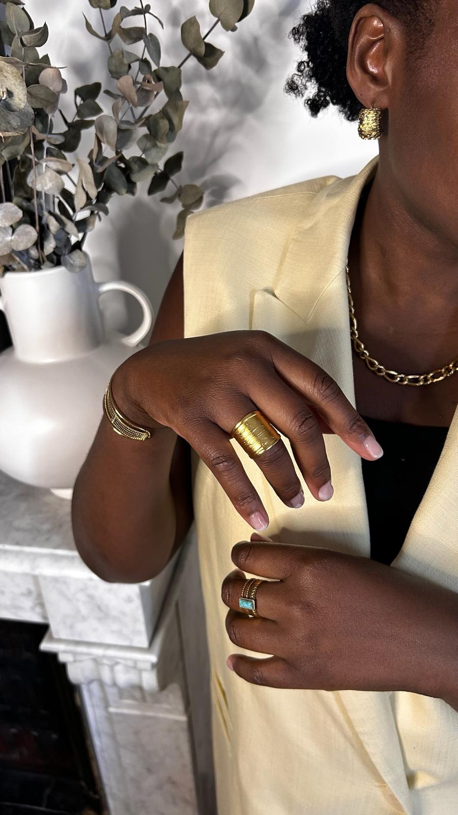 Elégante, cette bague dorée en acier inoxydable et ajustable, au fini martelé rend hommage aux traditions africaines où les bijoux imposants symbolisaient prestige, héritage et puissance.